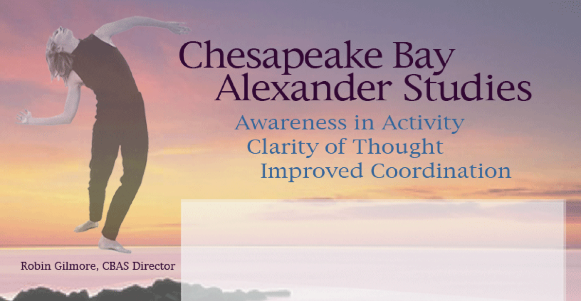 CHESAPEAKE BAY ALEXANDER STUDIES (CBAS) offers a range of opportunities to learn about the Alexander Technique. Beginning students can take a series of private lessons or attend an introductory workshop. More advanced students may continue with private lessons, attend a residential workshop or organize a workshop taught by Robin Gilmore to address a particular activity such as playing music or riding horses.